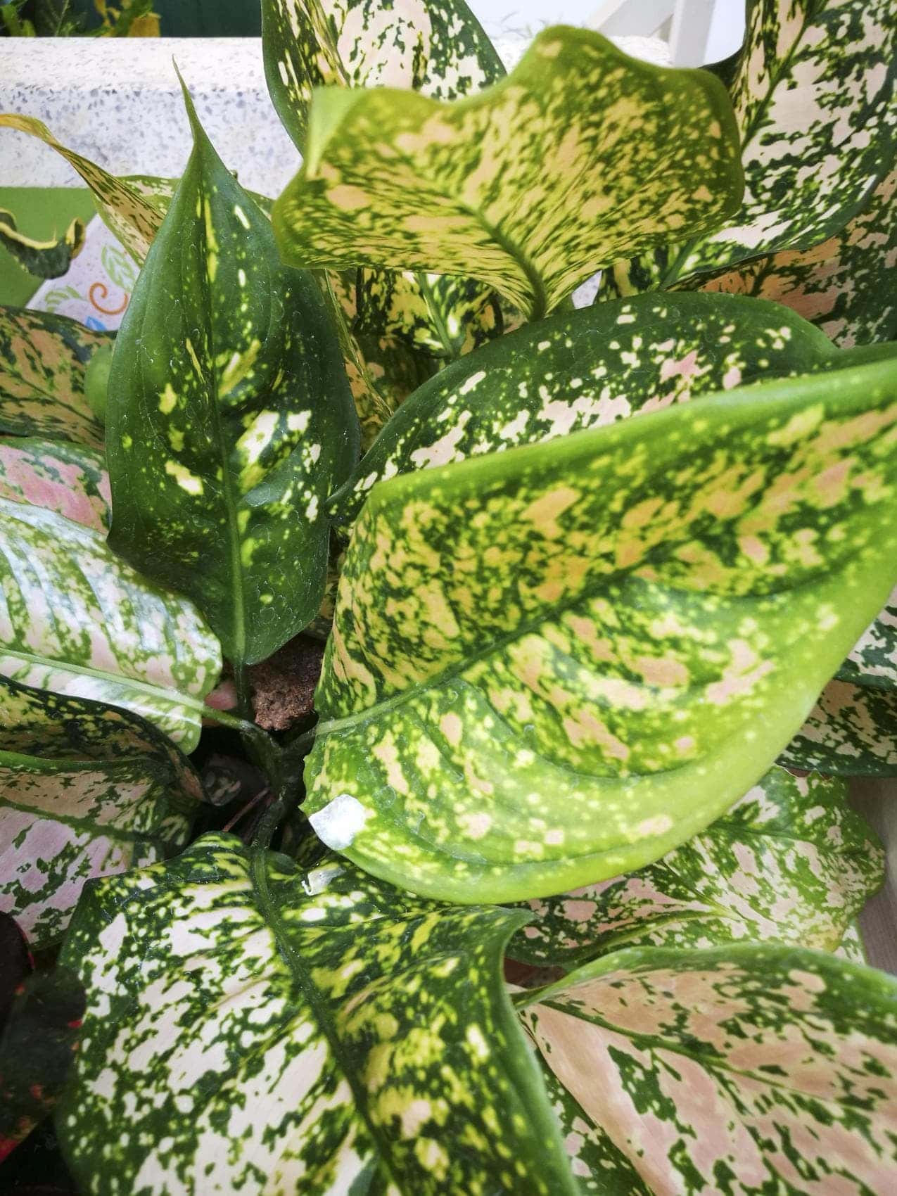ใบ ใบเดี่ยว ค่อนข้างตั้ง รูปไข่ รูปรีกว้าง ปลายแหลมถึงเรียวแหลม โคนสอบหรือตัด ขอบใบเรียบถึงเป็นคลื่นเล็กน้อย ใบหนาคล้ายแผ่นหนัง ค่อนข้างเรียบ เกลี้ยง เป็นมัน ยาวประมาณ 12-18 เซนติเมตร กว้างประมาณ 7-9 เซนติเมตร ก้านใบกลมเป็นร่องสีเขียว ยาว 5 เซนติเมตร กว้าง 0.2 เซนติเมตร ลิ้นใบสีเขียว ยาว 0.3 เซนติเมตร กว้าง 0.1 เซนติเมตร ค่อยๆแผ่กว้างไปตามความยาวของกาบใบ กาบใบสีเขียวเป็นร่อง ยาว 3 เซนติเมตร กว้าง 0.2 เซนติเมตร ห่อหุ้มลำต้น ขอบใบสีเขียวเข้มเป็นแถบเล็กตลอดแนวขอบใบ แผ่นใบสีชมพูปนสีเขียวกระจายอยู่ตามเส้นใบ เส้นกลางใบสีเขียวเข้ม ใต้ใบสีคล้ายแผ่นใบแต่ชัดกว่า เส้นกลางใบนูนเด่นชัดบริเวณโคนและค่อยๆเล็กลงจนสุดปลายใบ