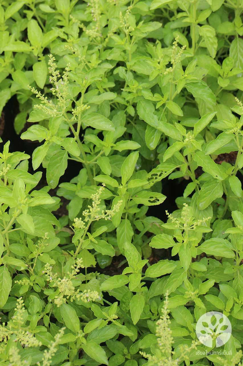 2. กระเพราใบเขียว ก้านเขียวหรือก้านขาว เป็นพันธุ์ที่มีก้านใบ ก้านดอก ใบ เป็นสีเขียว และดอกเป็นสีขาว