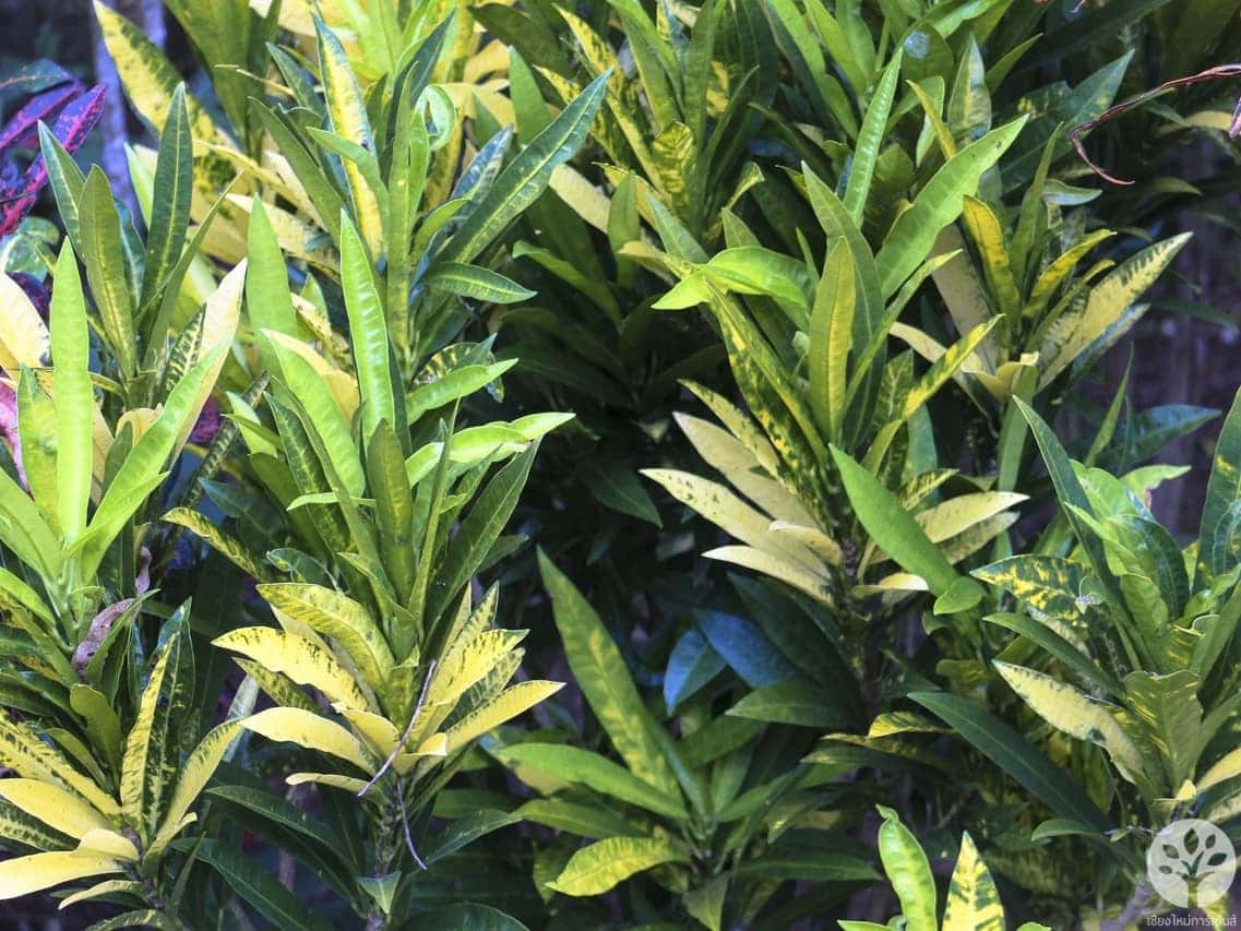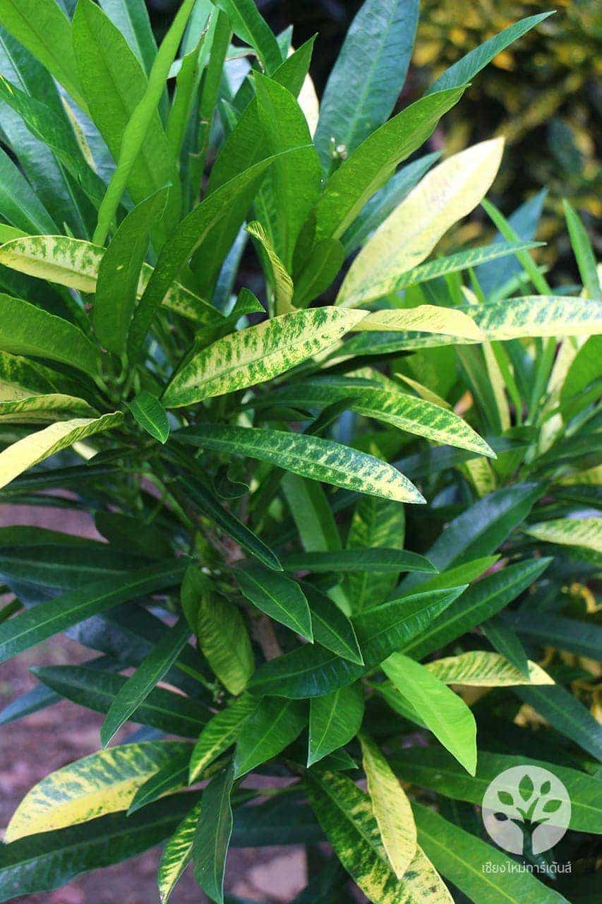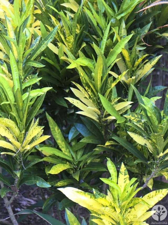 ใบ ใบเดี่ยว เรียงเวียนค่อนข้างถี่ รูปขอบขนาน ก้านใบยาวประมาณ 2.2 เซนติเมตร ปลายแหลม โคนสอบ ขอบเรียบถึงหยักเล็กน้อย ใบล่างขอบใบสีเขียวเข้ม บริเวณกลางแผ่นใบสีเหลือง ใบอ่อนสีเขียวอ่อนอมเหลือง เส้นใบสีเหลือง ใบยาวประมาณ 11.5 เซนติเมตร กว้างประมาณ 2.3 เซนติเมตร